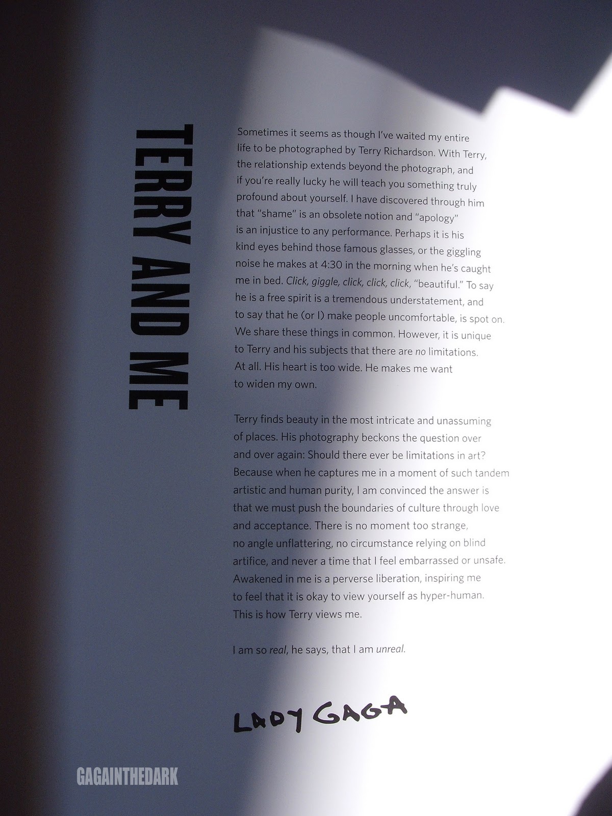 El famoso fotografo Terry Richardson y Lady Gaga se unieron para hacer un libro de fotos sobre la vida de Gagz a lo largo de mas de un año Terry ha tomado fotografias en cada momento de la vida de Gagz.